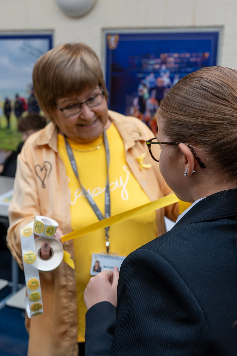 Embracing the colour yellow, promoted by YOUNG MINDS, the day began with a wave of cheerful engagement. As pupils arrived, school staff were stationed in the Atrium handing out yellow ribbons and stickers to encourage a visual show of support. Many pupils and staff readily sported these symbols, setting an encouraging and upbeat tone for the day. Posters reinforcing the message of support were prominently displayed across the school grounds.